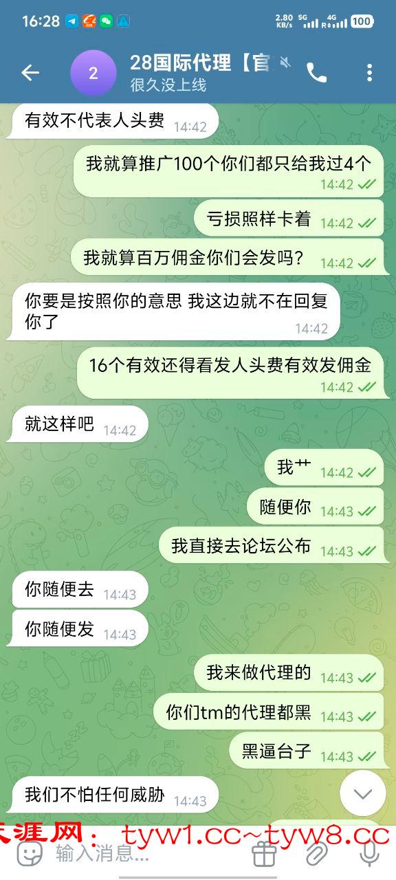 我现在只想在论坛曝光他们,666彩金我也不要了 ,避雷大哥嘛,真心的,无论代理还是玩家都不要去28国际玩,只要去了她家做代理基本就是黑奴,别想给你算佣金算人头费,然后客服也是不要逼脸,我已经放弃希望了。没有选择好平台,在一个垃圾平台把自己做夸了。