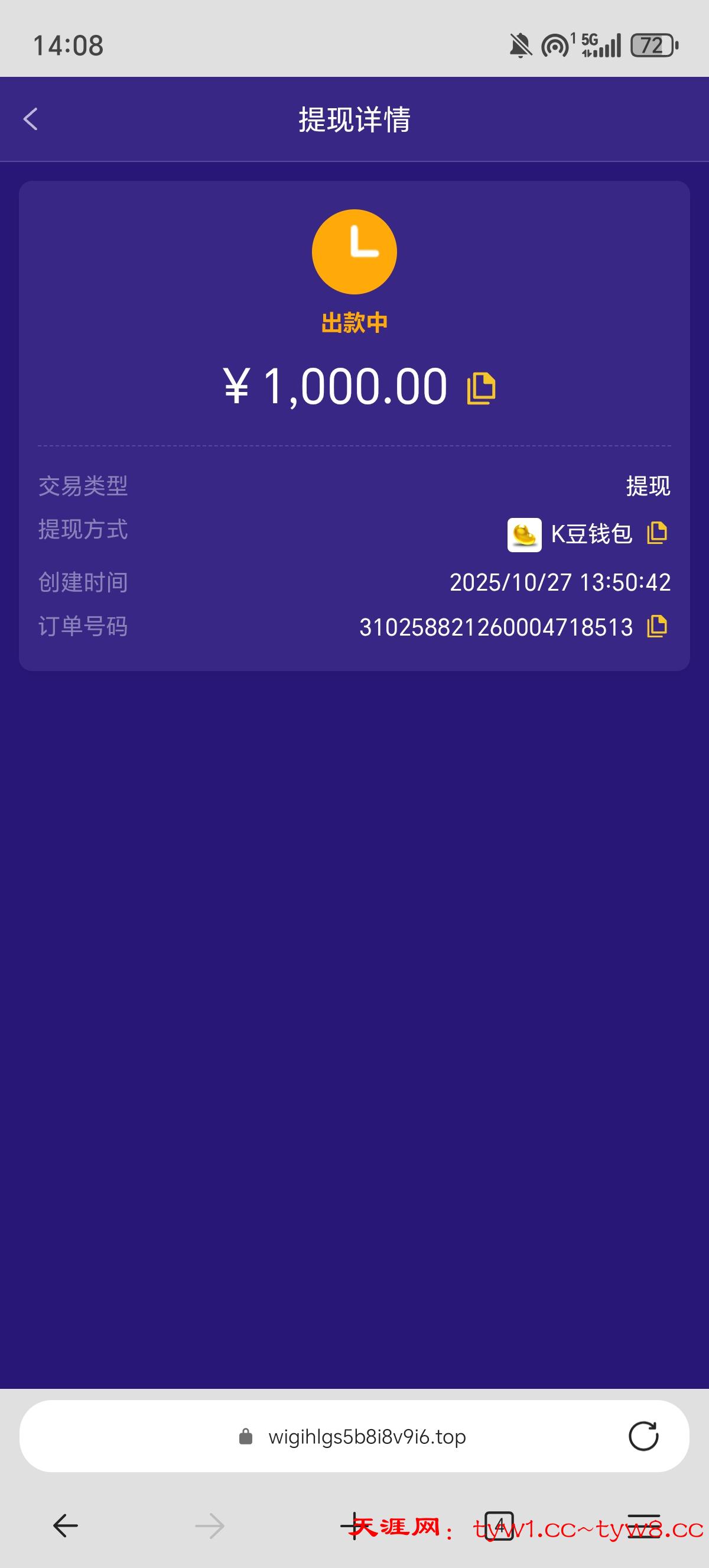 大水提了1k的k豆。就是半小时还没到,到账很墨迹
