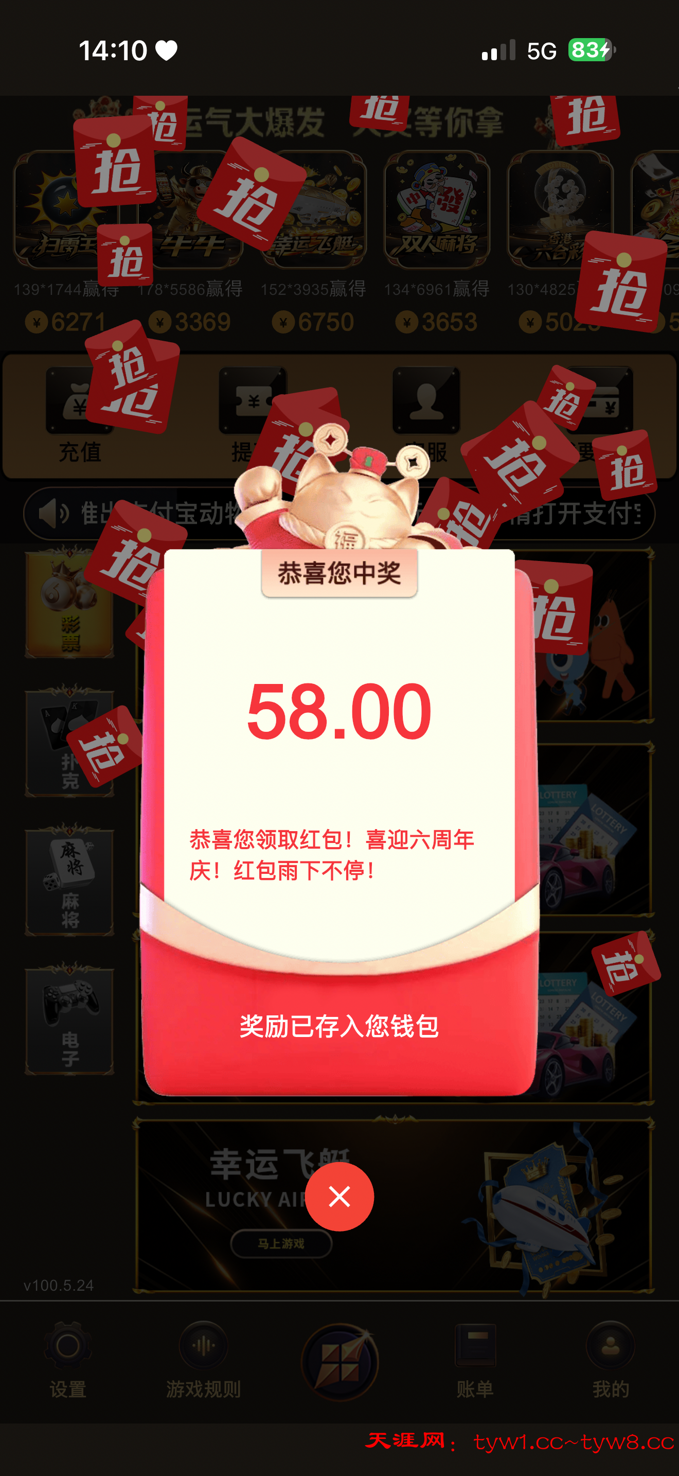 前几天接到电话领了58 以为是个黑台 送了三四天58 每次打到几百几千 都随便玩 以为出不了 昨晚的时候尝试提款 其实58 你们打到100就可以出了 100以上随便提 提支付宝或者微信一个小时不到 取消 提钱包秒到一开始我还不信 提了两三次了 反正分逼没充 注册了特邀的才会有红包 不是特邀注册了 没红包别骂 网址